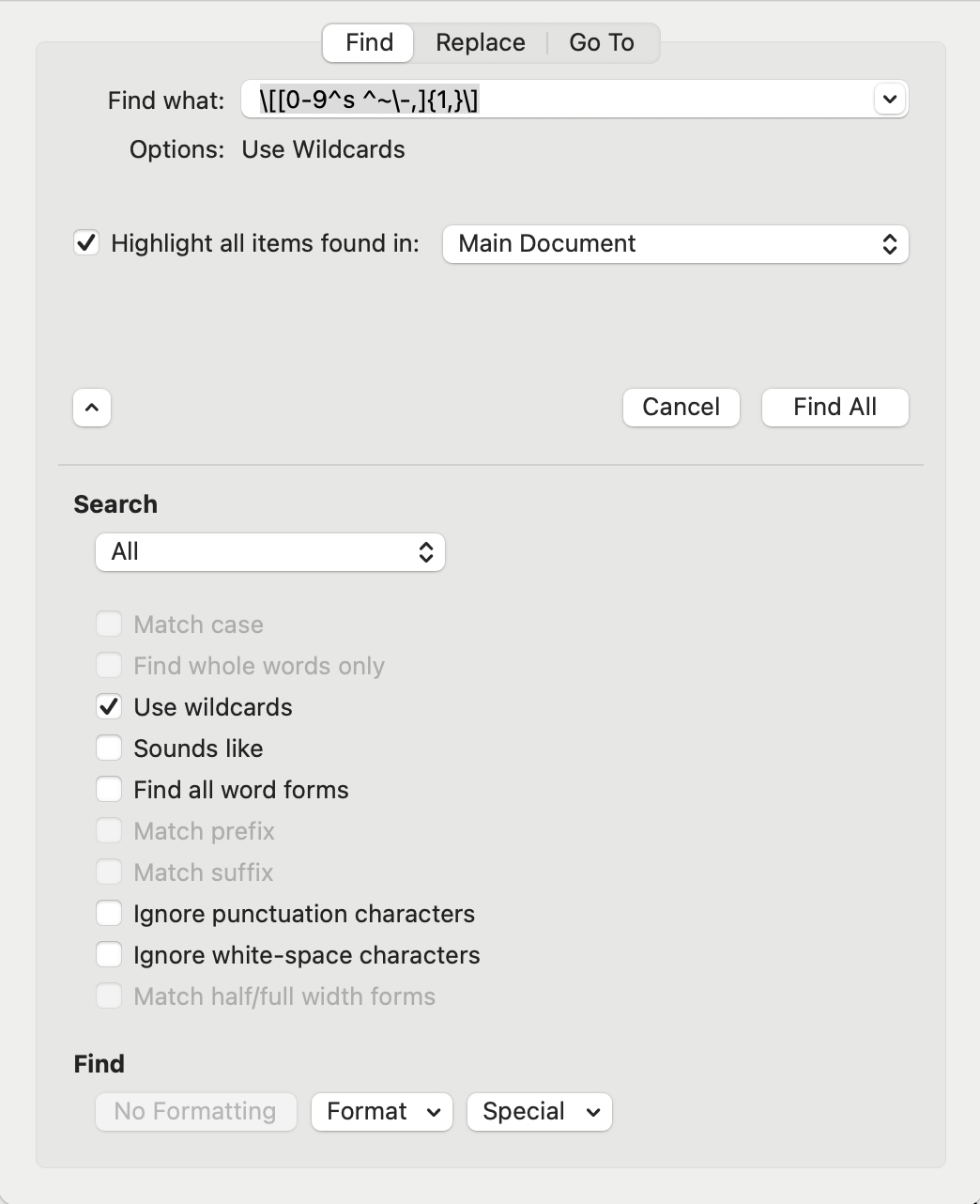 - Select "Highlight all items found in: Main Document"